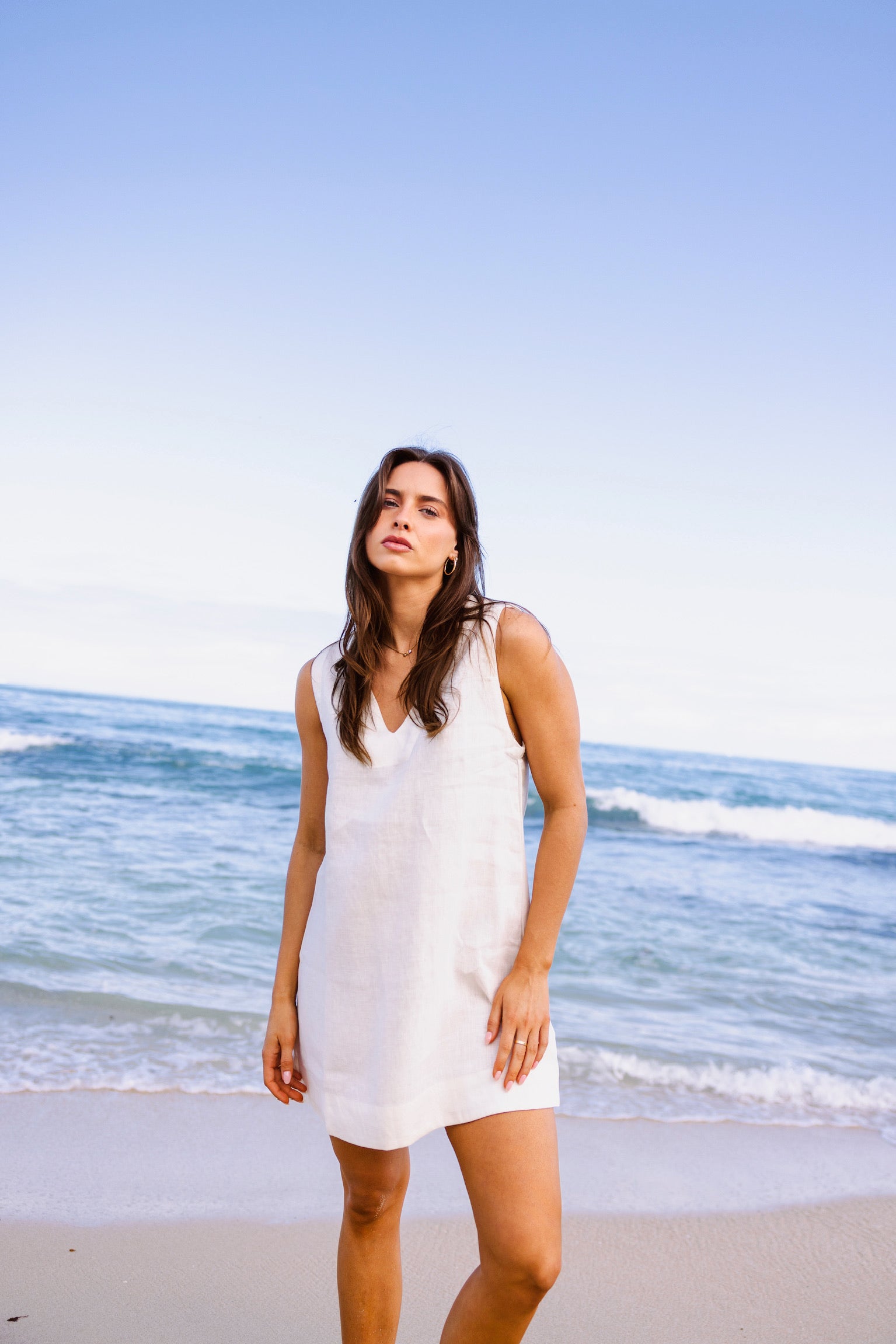 Embrace timeless elegance with the Cameron dress, crafted from 100% linen in a rich butter hue. This versatile piece features a flattering V-neckline and distinctive wide hem detail that creates a beautifully relaxed silhouette. Perfect for sunset dinners or seaside escapes, the natural drape of linen keeps you cool while exuding effortless sophistication. Transition seamlessly from beach to evening with this holiday essential.