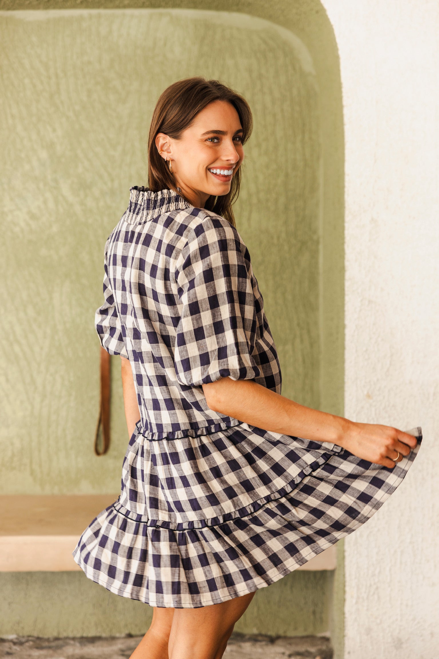 The Gigi dress brings timeless charm to your warm-weather wardrobe with its classic blue and oatmeal gingham pattern. Featuring relaxed short sleeves with elasticated cuffs and a flattering V-neckline adorned with delicate rouched detailing, this piece effortlessly combines comfort with sophisticated style. The drop waist silhouette flows into a tiered skirt with playful ruffle features, creating beautiful movement with every step. Perfect for poolside moments or beachside lunches.